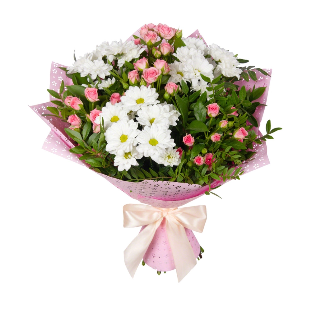 Букет «Волшебный сад» – гармония кустовых роз и белоснежных хризантем
